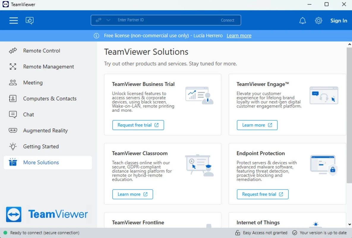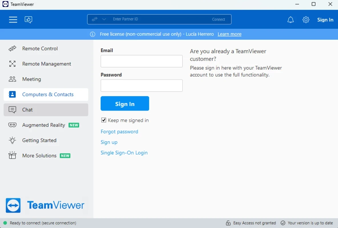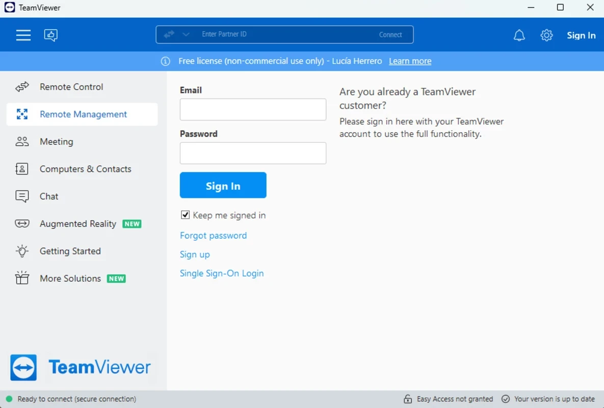توفر الواجهة سهلة الاستخدام اتصالاً عن بُعد سهلاً وسريعًا، حيث ستجد علامات تبويب إضافية في اللوحة اليسرى، بما في ذلك "التحكم عن بُعد"، و"الإدارة عن بُعد"، و"الاجتماعات"، و"أجهزة الكمبيوتر وجهات الاتصال"، و"الدردشة"، و"الواقع المعزز"، و"البدء". يمكنك عرض شريط الحالة أثناء الاتصال بنظام آخر، ويمكنك بسهولة عقد اجتماعات باستخدام علامات التبويب مثل "الصفحة الرئيسية"، و"الإجراءات"، و"العرض"، و"التواصل"، و"الملفات والإضافات" من أعلى الشاشة.